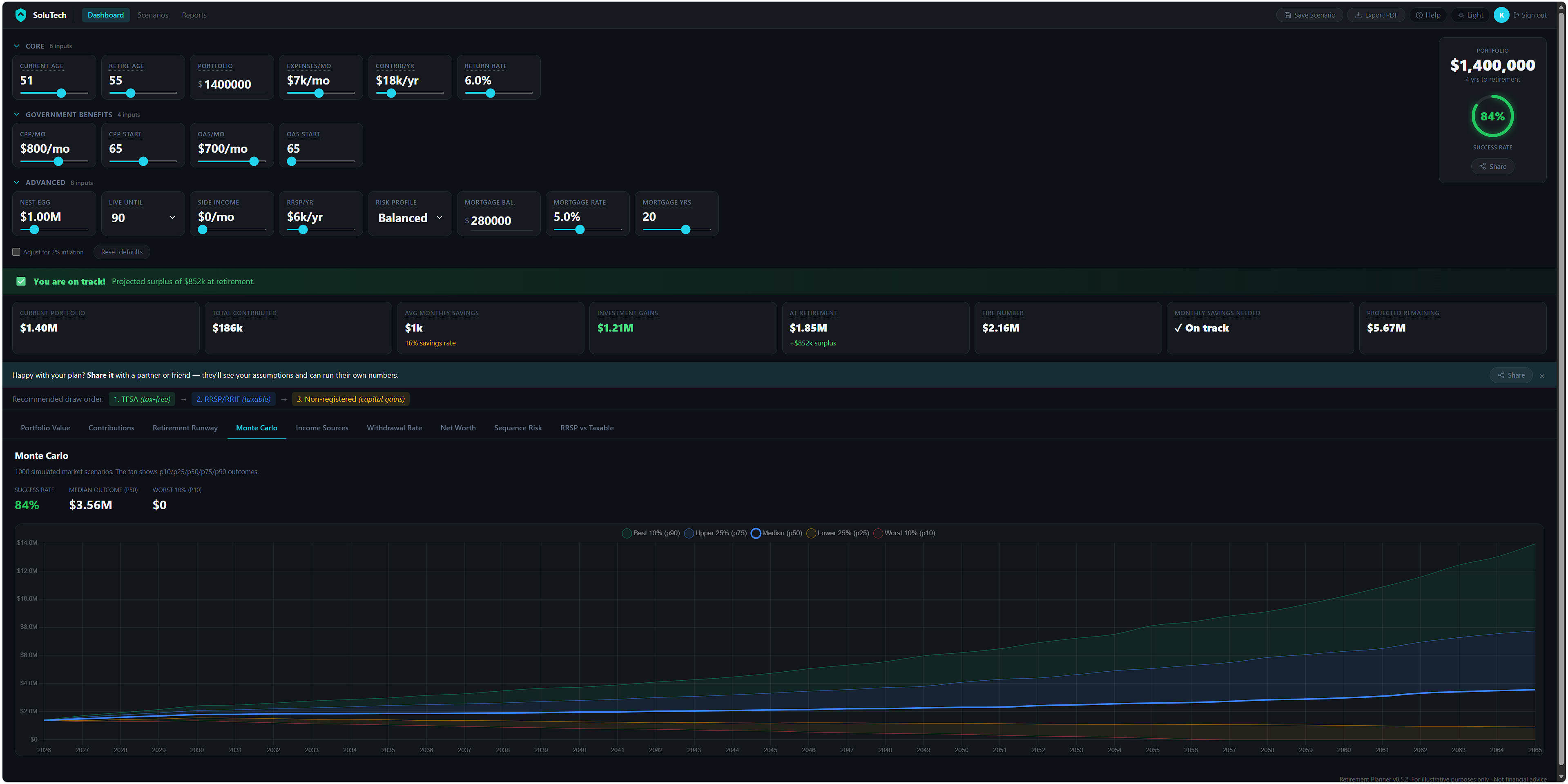 Solutech Retirement Planner dashboard showing Monte Carlo simulation, portfolio projection, and income sources
